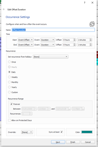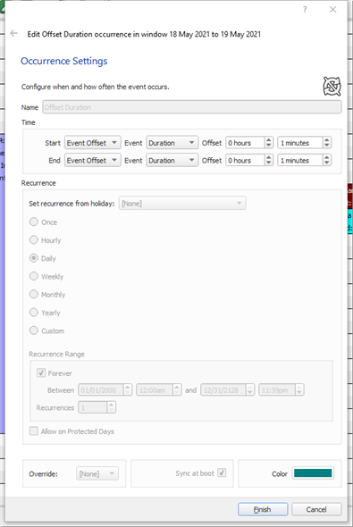 Example: Consider a recurring timed event that occurs every Monday from 9:00 to 11:00 a.m. Create an exception to Monday, July 4th, where that occurrence is deleted. Alternatively, create an exception to the second Monday of each month, where that occurrence takes place from 10:00 - 11:45 a.m. instead. All other timed events in the schedule remain as they were originally defined. Only the set exceptions will be altered.