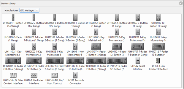 Control stations and sensors can be added to the Design view by simply dragging and dropping the station from the Station Library into the Plan workspace. Stations in the library are shown by Manufacturer, and in the case of the ETC's stations and sensors, ETC Paradigm or ETC Heritage.