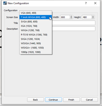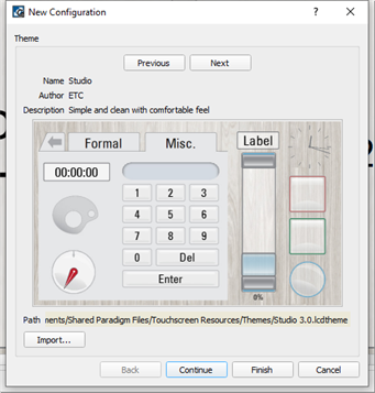 - After selecting or importing the theme, click the [Continue] button located at the bottom of the display. The wizard advances to the next dialog for configuration screen size resolution and configuration name specifications.