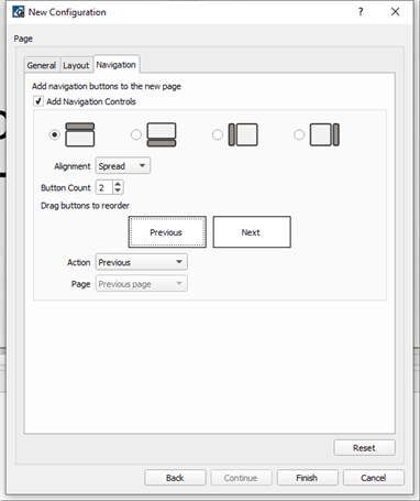 - Click on the Navigation tab. This display allows you to add navigation buttons (Next, Back, etc.) to the new page you have created. Navigation buttons allow movement between pages of the configuration on the Paradigm Touchscreen or Virtual Touchscreen.