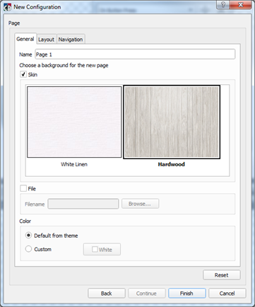 - Click [Continue]. The Page dialog displays. and is split into three tabular sections including General, Layout, and Navigation.