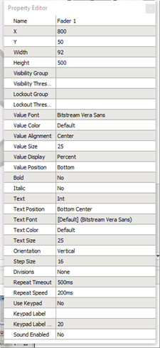 Faders may be created in a vertical or horizontal orientation, although when a fader is initially drawn, its orientation is set based on the aspect ratio of the control. You can change the orientation settings in the Property Editor.
