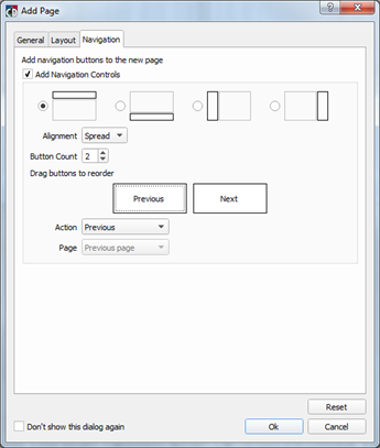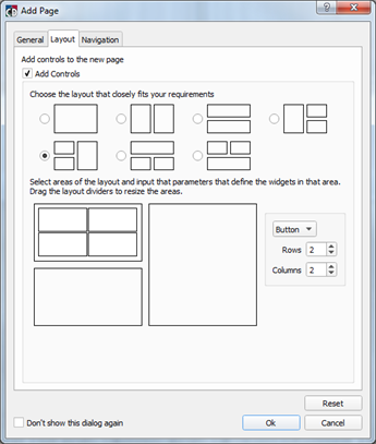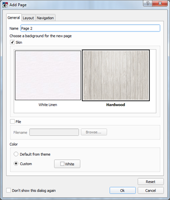 Note: Check "Don't show this dialog again" to suppress the wizard and instead always use the settings from the last page created when adding a new page to the current configuration. If you choose to suppress the wizard, you can always decide later to display the wizard again by changing the setting from the Application Preferences dialog.