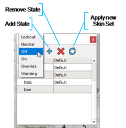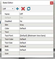States are used to graphically represent the status of objects, such as the status of a preset a button controls. A state's purpose is to make the control visibly different between state changes. The State Editor allows you to add, remove, and configure the states for a selected control(s) including some parent objects.