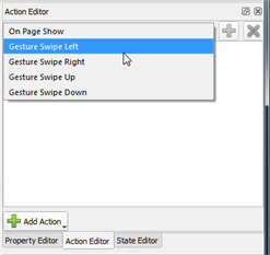 - Depending on the gesture selected, additional options display in the editor. Some actions require specification of a transition property. Reference Transitions for details.