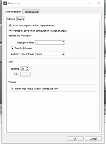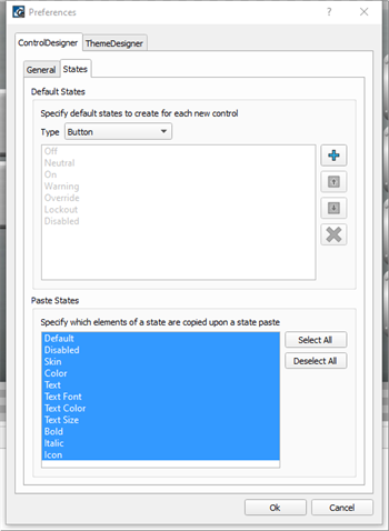Note: States specified in this preference dialog will be created for each new instance of a control type and will apply to any open configuration in ControlDesigner.