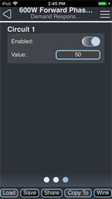 Swipe to the left or right to access the Demand Response page and enable or disable demand response for each circuit. Enter a Value between 0 and 99 to set the highest output level when Demand Response is Enabled.