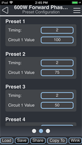 Swipe to the left or right to access the Preset Configuration page and set the default timing and circuit values for each programmed preset.