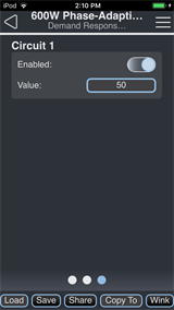 Swipe to the left or right to access the Demand Response page and enable or disable demand response for each circuit. Enter a Value between 0 and 99 to set the highest output level when Demand Response is Enabled.