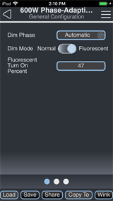 - Dim Mode - Tap to set the dimmer mode to either Normal or Fluorescent.Fluorescent Turn On Percent - Use the keypad to set the percent of output voltage at which you'd like the fluorescent fixtures to turn on.