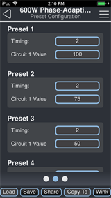 Swipe to the left or right to access the Preset Configuration page and set the default timing and circuit values for each programmed preset.