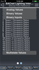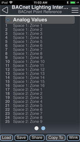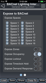 All 16 Echo Spaces can be controlled and monitored through BACnet client applications. Tap the box next to a space to expose it for BACnet control. A deselected space will not communicate any properties to BACnet.