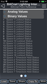 Note: When viewing each list, a point that is listed in white text is exposed for control and is available for BACnet client use. Any point that is gray is not exposed and therefore unavailable for BACnet control.