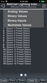 Note: The dots at the bottom of the screen indicate additional pages of configuration for the selected interface. Swipe left or right to access the BACnet Points page.