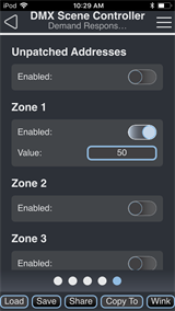 Use the Enabled switches to enable or disable demand response for individual zones or all unpatched addresses and set an output level limit value between 0-99% that applies while demand response is enabled.