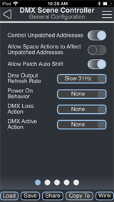 - Power On Behavior - choose a behavior that will automatically occur when the DMX Scene Controller is powered on.