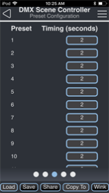 The Preset Configuration page allows for the configuration of each local preset's fadetime. This is the time that the preset will take when activated or deactivated.