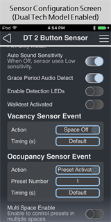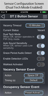 When you choose to configure a Dual Tech Switch-mount Occupancy Sensor with the EchoAccess App, a representative image of the selected sensor will display including labels for the currently configured sensor and button assignments (below left). Tapping the sensor (top) will bring you to the sensor configuration screen shown below right. To configure buttons on the switch-mount occupancy sensor, see Configuring Buttons (Switch-mount Occupancy Sensor Only). Configuring a Dual Tech Ceiling-mount or Wall-mount Occupancy Sensor will take you immediately to the sensor configuration screen shown below right.