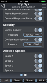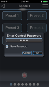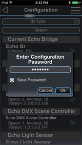 When set to On, Control Security restricts access to an Access BT Interface or Expansion Bridge. When you attempt to connect to an interface, a password screen appears. Select [Save Password] to store the password in the EchoAccess App.