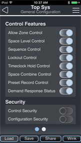 Control Features set the visibility of controls within the EchoAccess App including Allow Zone Control, Space Level Control, Sequence Control, Lockout Control, TimeClock Hold Control, Space Combine Control, Preset Record Control, and Demand Response.