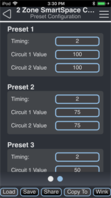 Swipe to the left or right to access the second page and set the default timing and circuit values for each programmed preset.
