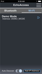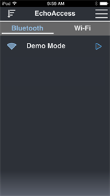 Demo Mode simulates an Access BT Interface or Expansion Bridge, allowing you to explore the EchoAccess App features when no Access BT Interfaces or Expansion Bridges are available. To access Demo Mode, you must turn on the Demo Mode switch in the Settings menu.