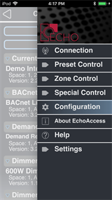Tap the Main Menu icon located in the upper right corner of the EchoAccess App screen to display the Main Menu options. In Demo Mode, the same options appear as the standard Main Menu when connected to an Echo control system.