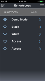 To connect to an Echo control system, launch the EchoAccess App on your compatible device. The Connection page displays for selection of the connection type, either Bluetooth or Wi-Fi. Choose to connect to either a Bluetooth system or a Wi-Fi system by swiping right or left. All systems that are discovered within range will be listed. Demo Mode is only visible as a Wi-Fi or Bluetooth interface choice if Demo Mode is enabled in the Special Control menu.