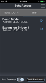 Note: If the Expansion Bridge you are expecting to connect to does not display, your Wi-Fi network may not allow multicast traffic. Do the following: 1) enable "Auto Discover" by toggling the Auto Discover switch so the switch is highlighted and the circular handle is on the right end of the slot, 2) manually enter the configured Expansion Bridge(s) IP Address into the application using the [Add IP Address] feature. Once the Expansion Bridge has been discovered and configured for the EchoAccess App, the device will display in the list for all future connections.
