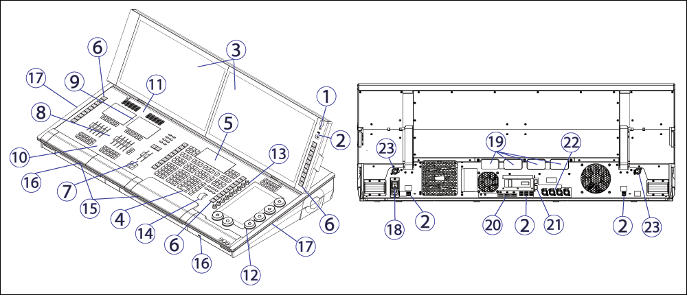 13. Mini-Encoder 14. Pegelrad 15. Tastatur/Zubehörfach 16. USB-A (nur Stromversorgung) 17. Leselampen 18. Kippschalter für Spannungsversorgung/IEC-Buchse 19. IO-Garage 20. Display Port 21. SFP+ 22. Ethernet 23. Pultleuchte |