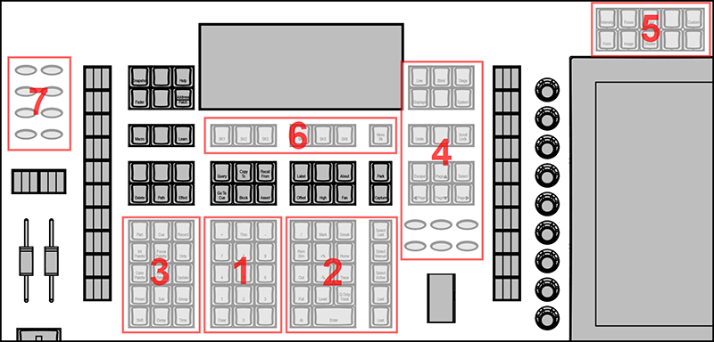 Weitere Bedientasten bieten Optionen für eine Vielzahl häufig verwendeter Konsolenfunktionen und Shortcuts zu verschiedenen Blind-Anzeigen.
