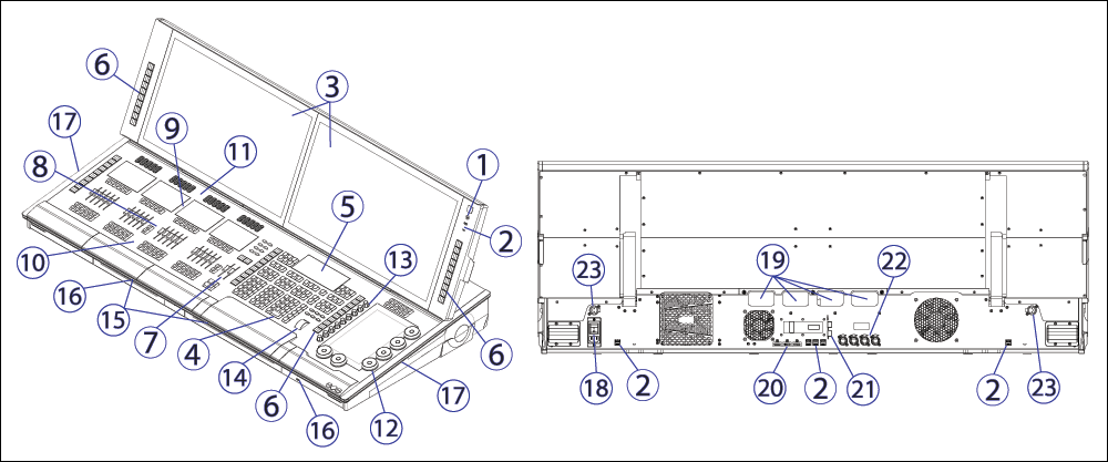13. Mini-Encoder 14. Pegelrad 15. Tastatur/Zubehörfach 16. USB-A (nur Stromversorgung) 17. Leselampen 18. Kippschalter für Spannungsversorgung/IEC-Buchse 19. IO-Garage 20. Display Port 21. SFP+ 22. Ethernet 23. Pultleuchte |