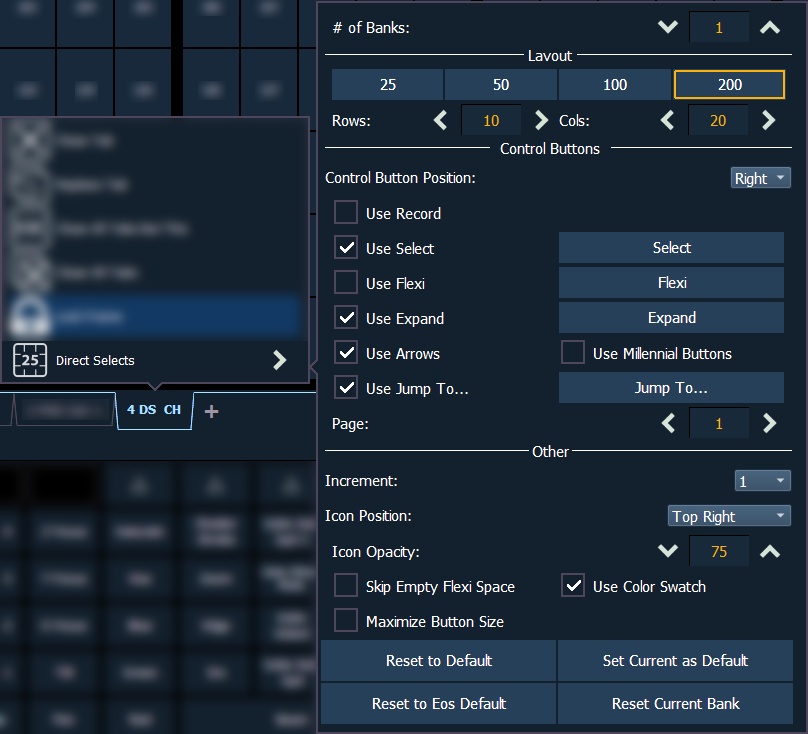 - {Rücksetzen auf Eos Standard} – setzt die Einstellungen auf die Eos-Standardeinstellungen zurück.