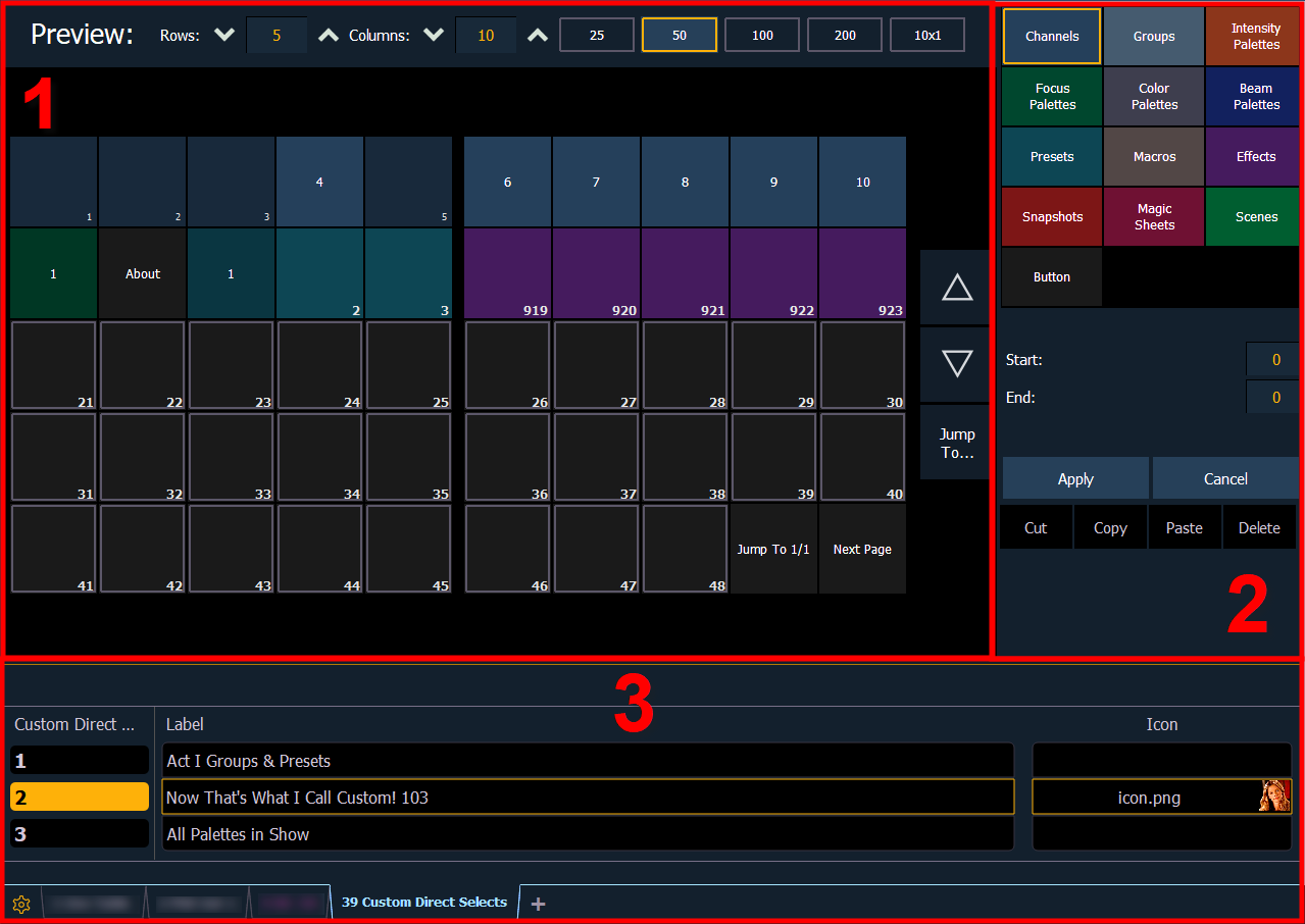 Note: Custom-Direkttasten, die in einer Eos-Version vor 3.1.0 erstellt und in Snapshots gespeichert wurden, werden automatisch in eine Custom-Direkttastenliste konvertiert, die mit der entsprechenden Snapshot-Nummer versehen ist.