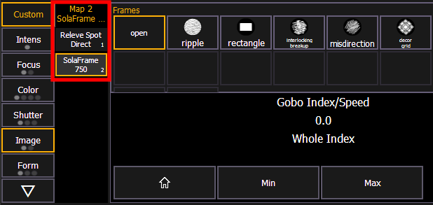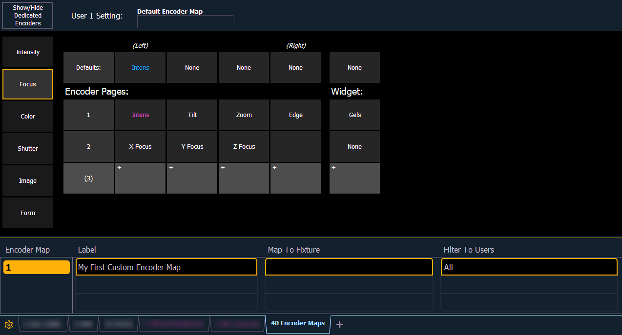 Der benutzerdefinierte Modus muss mit {Custom} aktiviert werden, um benutzerdefinierte Encoder-Maps zu verwenden. Wenn der benutzerdefinierte Modus ausgeschaltet ist, verwendet Eos die Standard-Parameterzuordnung.