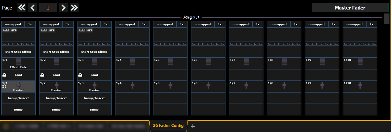 Die Faderkonfiguration finden Sie in Tab 36. Die Faderliste, in der alle Fader und ihre Zuweisungen aufgeführt werden, befindet sich in Tab 35.