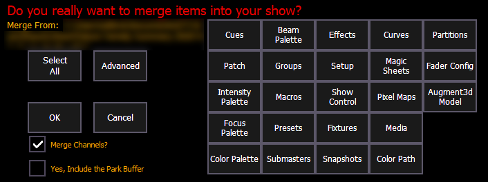 Um eine Vorstellungsdatei zu mergen, im Browser zu Datei > Merge navigieren. Zum gewünschten Dateispeicherort navigieren und [Select] drücken. Wird Merge verwendet, zeigt Eos nur die verfügbaren Dateien an. Zur gewünschten Datei navigieren und [Select] drücken.