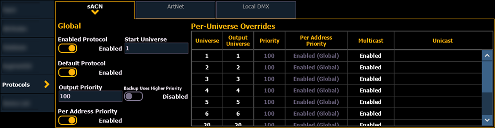 Wenn dies aktiviert ist, können individuelle sACN-Ausgabeprioritäten für jede gepatchte Adresse über die entsprechende Spalte im Patch-Hauptanzeige eingegeben werden. Siehe Patch > Patch.