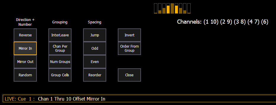 - [1] [Thru] [20] [Offset] [Even] [+] [60] [Thru] [80] [Offset] [3] [Enter] – wählt alle geraden Kreise zwischen 1 und 20 und alle ungeraden Kreise zwischen 60 und 80 aus.