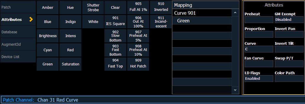 Kennlinien können auch auf Geräte mit Nicht-Intensitätsparametern (NIP) angewendet werden. Wenn unter Patch > Attribute > Kennlinie ein Kreis mit NIP angewählt wird, werden im ZIB einzelne Schaltflächen für jeden verfügbaren Parameter angezeigt. Klicken Sie auf eine oder mehrere Schaltflächen, um eine Kennlinie auf den/die gewünschten Parameter anzuwenden.
