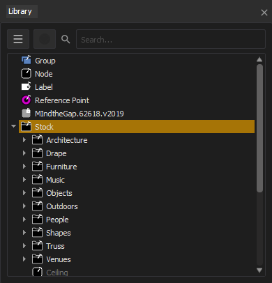 Die Bibliothek enthält alle Elemente in einem Augment3d-Projekt, die keine Geräte sind, und ist für Sie bereits mit einer großen Anzahl von Bestandsobjekten ausgestattet. Sie können auch Ihre eigenen Augment3d-Objekte importieren (siehe Augment3d-Objekte importieren).