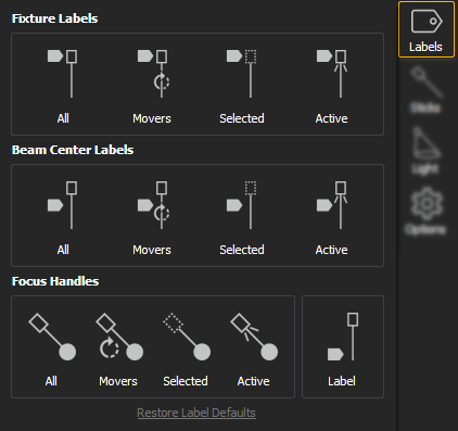 Schaltet Beschriftungen im Lichtkegel für alle, Movinglights, ausgewählte und/oder aktive Geräte ein oder aus.
