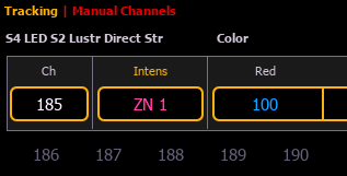Zonenbasierte Geräteanweisungen verändern gespeicherte oder manuelle Werte mit Override-Werten. Wenn ein oder mehrere Geräte-Beams die Zonengrenze eingehend überschreiten, wird Override angewendet, und die Geräte folgen der Zonenkonfiguration. Dies wird in Live durch pinkfarbenen Text angezeigt, der auf die Zonenquelle hinweist (siehe Farbkennungen).