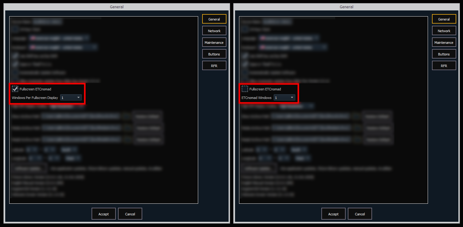 Wenn dies aktiviert ist, startet ETCnomad auf allen mit Ihrem Computer verbundenen Monitoren automatisch im Vollbildmodus. Wählen Sie „1“ im Dropdown „Fenster im Vollbildmodus“, um auf jedem Monitor eine einzige Vollbildanzeige von ETCnomad anzuzeigen, oder „2“, um jede Vollbildanzeige in zwei ETCnomad-Fenster zu unterteilen.
