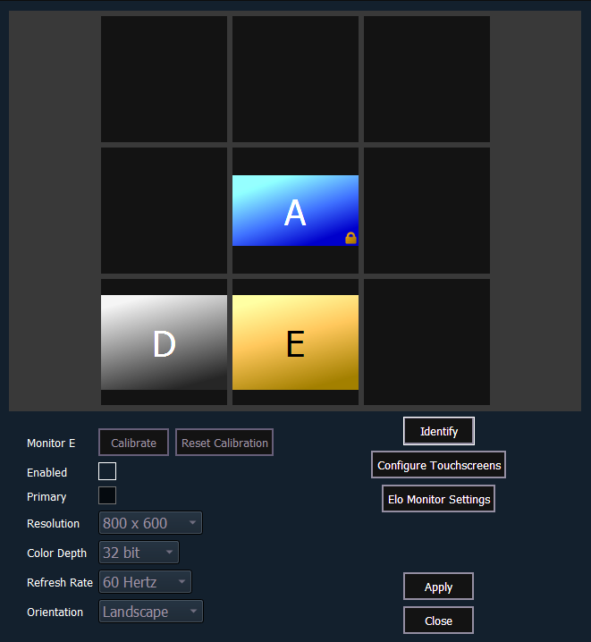 Note: Der ausgewählte Monitor wird gelb angezeigt. Externe Monitore können auf jedes beliebige umliegende schwarze Feld gezogen werden, um das tatsächliche Monitor-Layout nachzustellen. Interne Monitore sind im Verhältnis zueinander gesperrt und können nicht geändert werden.