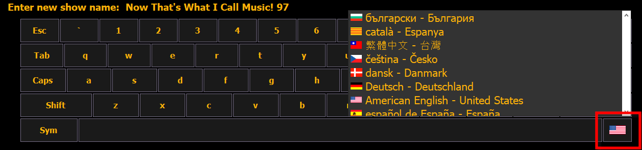 Hier können Sie die Sprache der alphanumerischen Tastatur für Eos festlegen. Es werden zahlreiche Tastaturen unterstützt.