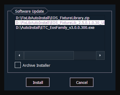 Wenn Sie auf {Software Update...} klicken, durchsucht die Konsole das Hauptverzeichnis sämtlicher angeschlossenen USB-Speicherlaufwerke nach einer Software-Update-Datei für eine Eos-Konsole. Die Namen sämtlicher Installationsdateien auf dem Laufwerk werden angezeigt. Wählen Sie die Datei aus, die Sie installieren möchten, gefolgt von {Installieren} oder {Abbrechen}. Die Software wird zuerst auf die Festplatte gespeichert, bevor das Installationsprogramm geöffnet wird.