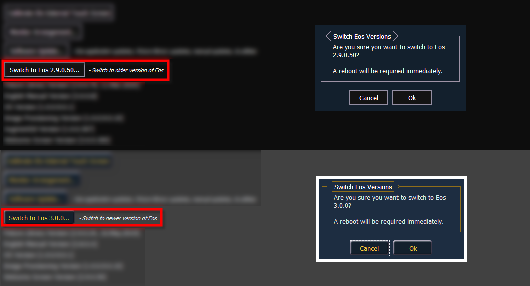 Mit Eos v3.0.0 wurde die Möglichkeit eingeführt, zwischen v2.9.x und v3.0.0 oder höher zu wechseln, wenn die Konsole beide Versionen ausführen kann. Wenn v2.9.x bereits installiert ist, wird bei der Installation von v3.0.0 oder höher automatisch die Version 2.9.x der Software beibehalten.