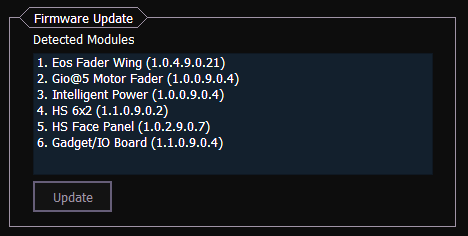 Bei der Auswahl eines Geräts wird die Schaltfläche {Update} gelb angezeigt, wenn das Gerät in diesem Fenster upgedatet werden kann. Dazu gehören auch Geräte, die derzeit nicht upgedatet werden müssen. Wenn die Schaltfläche grau erscheint, kann das Gerät in diesem Fenster nicht upgedatet werden.