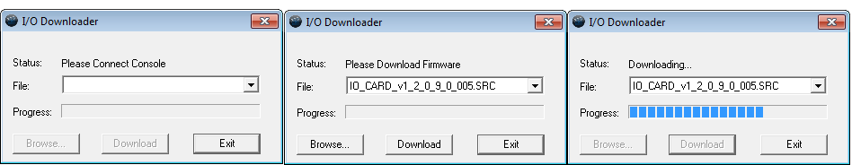 Wenn Sie das I/O-Downloadprogramm zum ersten Mal öffnen, sucht es nach der angeschlossenen Konsole. Dies kann ein paar Sekunden dauern. Sobald das Downloadprogramm die Konsole gefunden hat, sucht es nach den erforderlichen Dateien. Wenn die Datei gefunden wird, wird sie aufgelistet und Sie können auf {Download} klicken. Wenn die Datei nicht gefunden wird, können Sie mit {Browse} nach der benötigten Datei suchen und sie auswählen. Sobald Sie fertig sind, klicken Sie auf {Exit}.